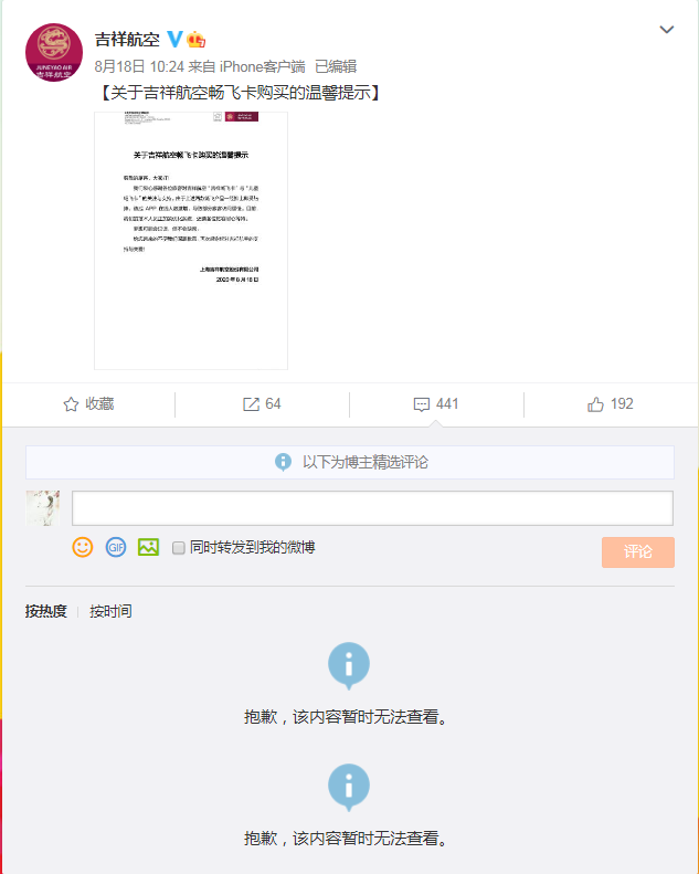 不仅如此,记者还注意到,吉祥航空关闭了这条微博下的评论,记者也在微博下评论,但只显示微博评论条数有增加,评论内容却不可查看。