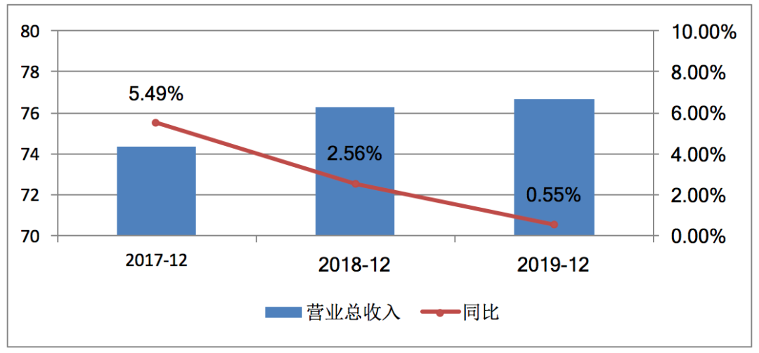 查阅该公司近三年业绩,《投资时报》研究员注意到,2017年—2019年,其营业总收入分别录得74.36亿元、76.26亿元、76.68亿元,同比变动幅度分别为5.49%、2.56%、0.55%;归母净利润为1.07亿元、1.37亿元、1.82亿元,同比增幅分别为69.88%、28.41%、32.59%。