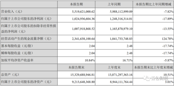 《五谷财经》粗略计算一下,2020年第二季度,古井贡酒实现营业收入约为22.39亿元,与去年同期23.19亿元相比,增幅在3.45%左右;归属于上市公司股东的净利润约为3.88亿元,相较于2019年第二季度约为4.65亿元,降幅在16.56%左右。