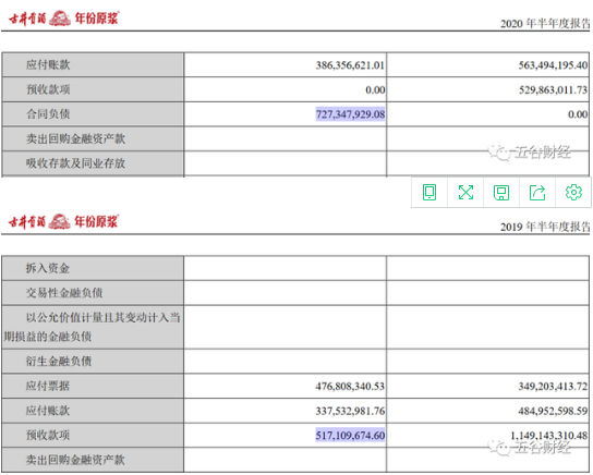 且2020年上半年末,古井贡酒的合同负债(相当于以前的预收账款)约为7.27亿元,与2019年末5.3亿元、2019年上半年末5.17亿元相比,都在大幅增长之中。
