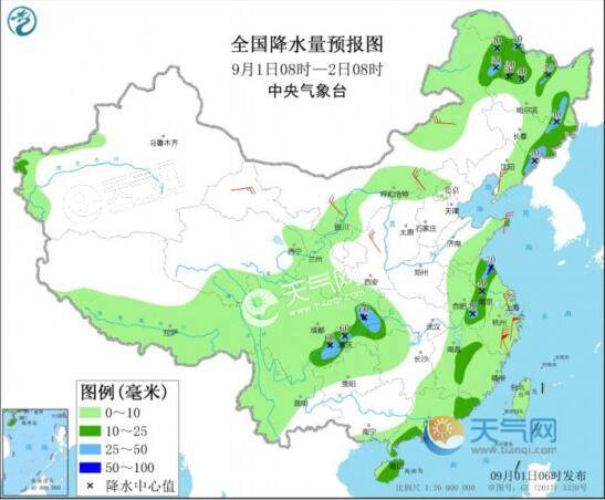 9月1日08时至2日08时,内蒙古东北部、东北地区北部和东部、江苏中北部、安徽中南部以及四川盆地东部等地部分地区有中到大雨,其中,江苏中北部和四川盆地东部等地局部有暴雨(50~70毫米)。内蒙古中西部、甘肃河西、陕西北部、辽东半岛、山东半岛、江南东北部等地部分地区有4~6级风,其中,浙江中南部部分地区有7~8级风。