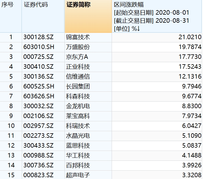 刚刚过去的八月,风光再A股苹果产业链现。Wind资讯数据显示,苹果概念板块中,有15只个股的月度涨幅跑赢沪指。其中,锦富技术(300128.SZ)、万盛股份(603010.SH)、京东方A(000725.SZ)、正业科技(300410.SZ)、信维通信(300136.SZ)等5只个股累计涨逾12%。