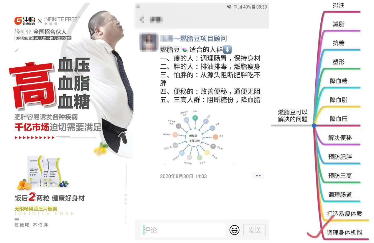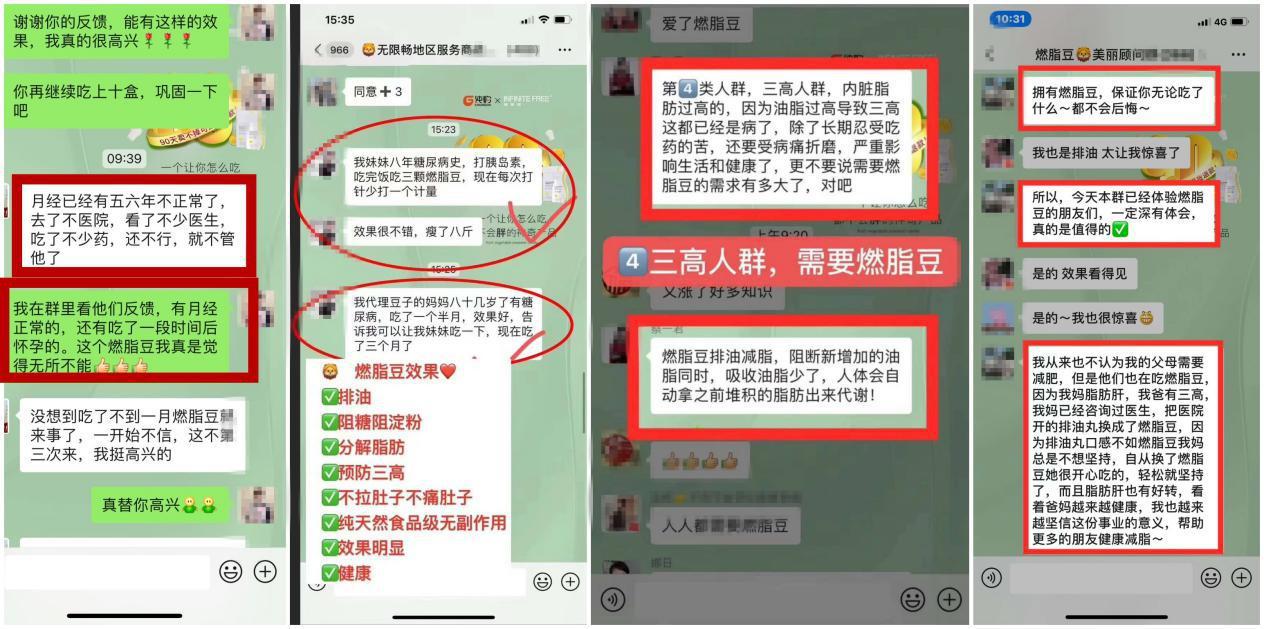 值得注意的是,该代理商在微信朋友圈和群聊多次转发“无限畅燃脂豆”具有排油、减脂、降血糖、降血脂、降血压、缓解便秘、调理肠道、打造易瘦体质、调理身体机能、缓解脂肪肝等功效的宣传图。以及代理商和消费者吃了产品缓解便秘、调理三高等案例。