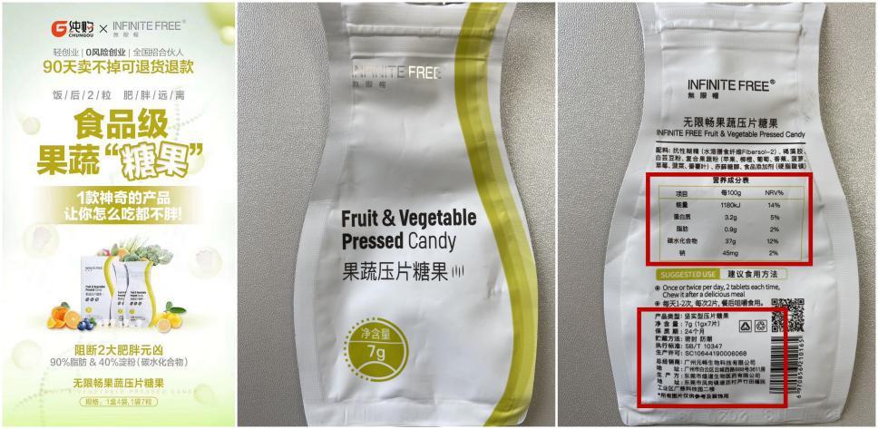 中国质量新闻网查询发现,上述“无限畅燃脂豆”实为坚实型压片糖果,属于普通食品,该产品包装显示配料为抗性糊精、褐藻胶、白芸豆粉、复合果蔬粉、赤藓糖醇、食品添加剂(硬脂酸镁)。营养成分表则显示,每100g中能量1180KJ,蛋白质3.2g,碳水化合物37g。