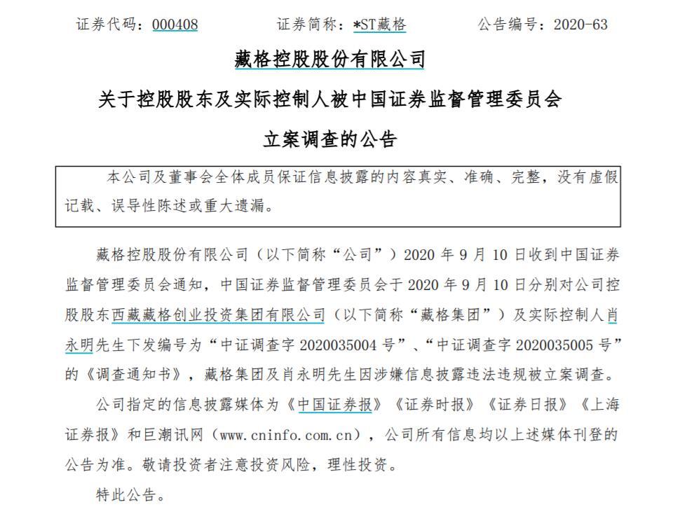 10日晚间,*ST藏格发布公告称,9月10日收到中国证监会通知,中国证监会当天分别对控股股东东西藏藏格创业投资集团有限公司(下称“藏格集团”)及实际控制人肖永明下发《调查通知书》,藏格集团及肖永明因涉嫌信息披露违法违规被立案调查。