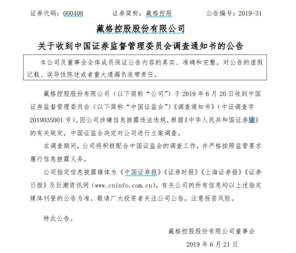 此后在2019年6月19日,深交所针对上述事项向藏格控股下发关注函。紧接着,藏格控股即发布公告称,因涉嫌信息披露违法违规,中国证监会决定对公司进行立案调查。