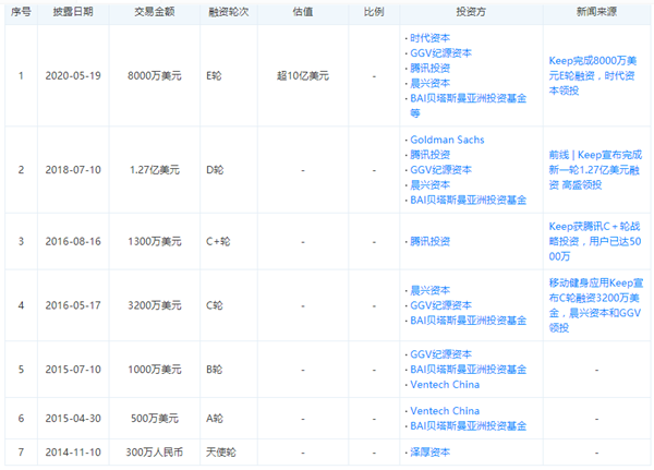 今年五月,Keep官方宣布了年初完成8000万美元E轮融资的消息,这一轮之后Keep估值超过了10亿美元。此前,Keep共完成六轮融资,累计融资1.87亿美元,上一轮为2018年7月高盛领投的1.27亿美元D轮融资。
