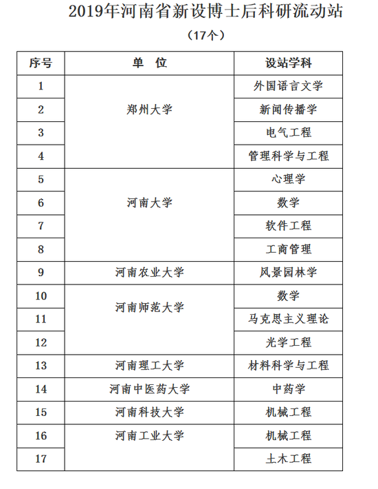 12月31日,本网从河南省人力资源和社会保障厅获悉,2019年河南省共8所高校新增17个博士后科研流动站和10个博士后工作分站。