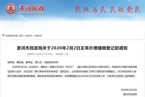 漯河市民政局1月14日就下发了《关于今年公历2月2日全市婚姻登记窗口正常工作的通知》,要求临颍县、舞阳县、郾城区、源汇区、召陵区民政局在2020年2月2日(正月初九,星期日)这个群众关注的“好日子”,安排婚姻登记处工作人员正常上班,为前来办证的新人提供服务。该局一名工作人员表示,定于2月2日领证的新人,可拨打各县区婚姻登记处电话提前预约。