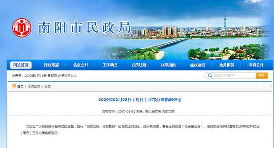 为回应广大市民群众最关切的愿望,践行“民政为民、民政爱民”的民政工作理念,南阳市民政局昨天经研究决定,各县区民政局(社会事业局)、市民政局相关科室在2020年02月02日(周日)正常办理婚姻登记。