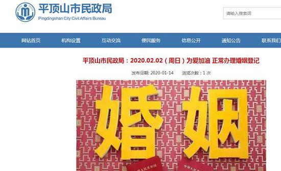 平顶山市民政局1月14日发布了《2020.02.02(周日)为爱加油 正常办理婚姻登记》的通知,安排各县(市、区)民政局婚姻登记处2020年02月02日(周日)正常办公,满足有情人的美好心愿,让新人们高兴而来、幸福而归。为避免当天排队,新人们可提前拨打所在县区民政局婚姻登记处电话进行预约。