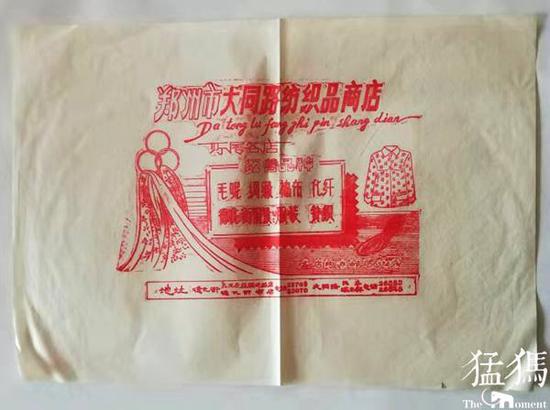那时候,不光是买糕点食品要用包装纸,就是到当时郑州市很有名气的郑州市百货大楼、手工业大楼、红旗大楼、紫荆山百货大楼、二七塔纺织品商店、德化街布店等购买各种针纺织品时都是用纸做的包装的。而且,许多大的国营商店包装纸上都印着自己的店名、商店建筑图案、经营品种、地址和电话。当然,也有一些小的商店为了降低成本,只用一张干净的纸来做包装。