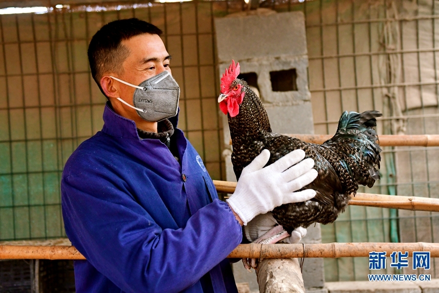 2月29日,河南省南阳市卧龙区潦河坡镇崔坊村,村民樊中阳正在查看芦花鸡。